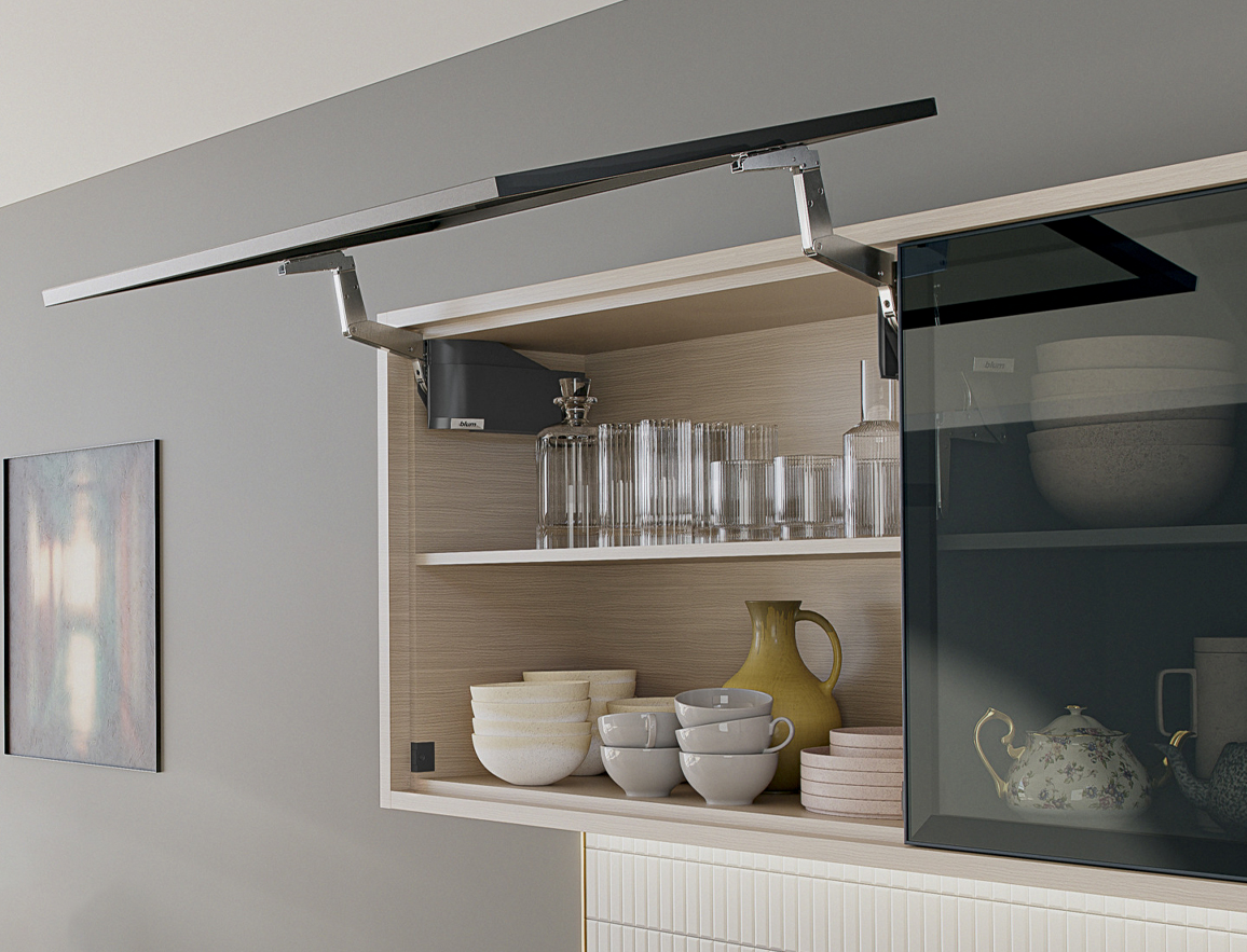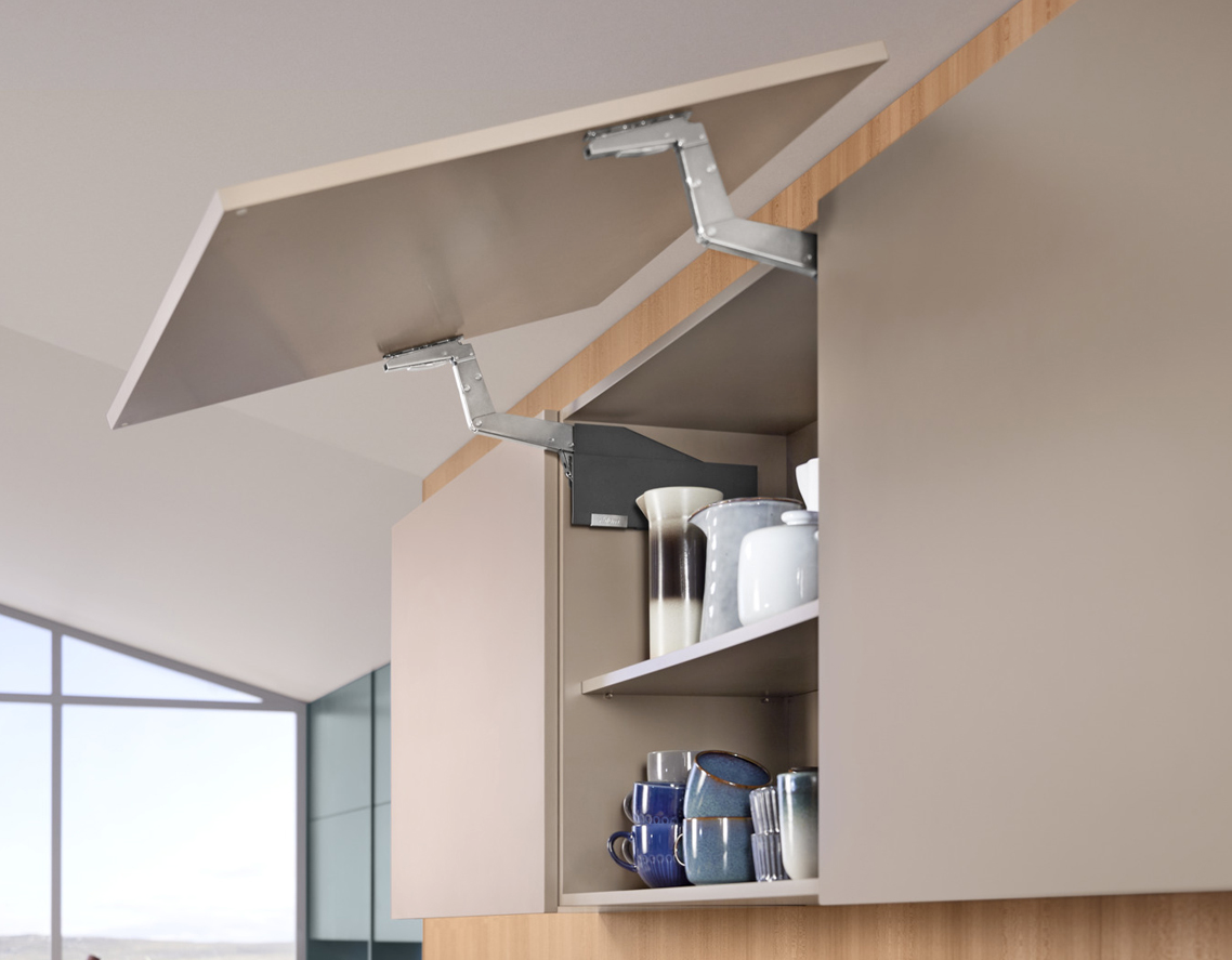 The AVENTOS HS top lift system in the wall cabinet exudes a sense of weightlessness.