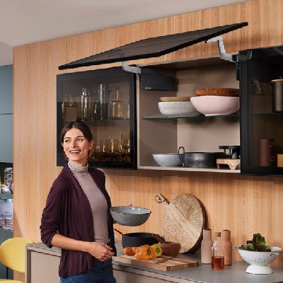 The AVENTOS HS top lift system in the wall cabinet exudes a sense of weightlessness.
