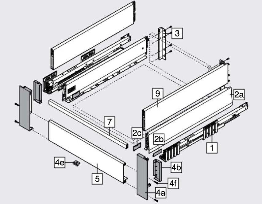 Included: Blumotion runners, sidesx2, boxcapsx2, front fascia and rail (to cut) with fixing set, fixing brackets or push-to-open tip-on mechanism.