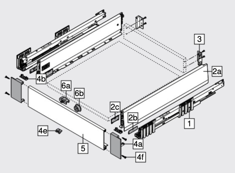 Included: Blumotion runners, sidesx2, fixing brackets, front fascia (to cut) with fixing set or push-to-open tip-on mechanism.