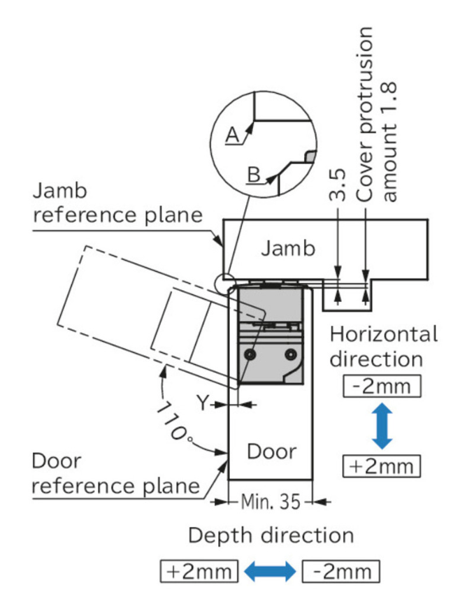 For doors 35mm thick doors the hinge will give 110º opening, adjustment bolts are concealed behind front covers which slip on and off easily.