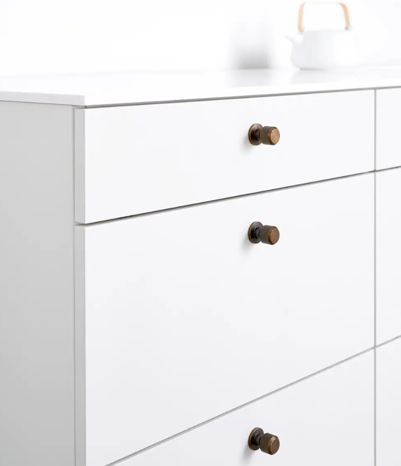 Part of knurled cabinet collection, overall length of 35mm, and 30mm diameter base. Each piece is precision engineered to add texture to an iconic industrial design. Works perfectly with various interior design styles including industrial, modern, transitional, and contemporary