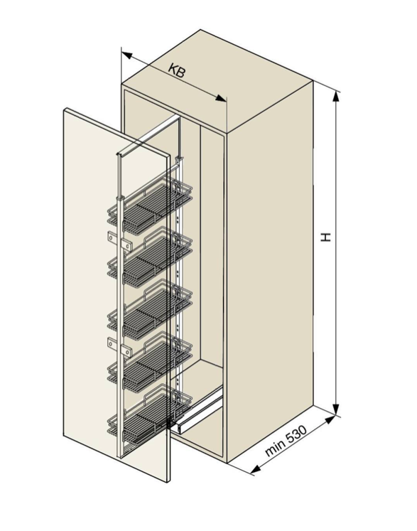 Pull-out larder unit with soft-closing concealed slides, perfect for efficient kitchen storage. This system boasts a 90kg load capacity, providing robust support for your pantry essentials. The set includes a sturdy frame, a bottom slide with soft-closing functionality, and an upper slide for smooth operation. Compatible with either 4 or 5 full-bottom baskets, depending on the unit height—for organised pantry access and optimal space efficiency. Built-in soft close and finish in desirable anthracite colour.