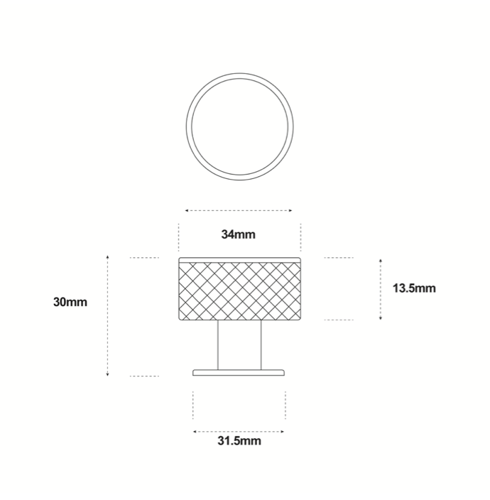 Part of knurled cabinet collection, overall length of 34mm, 30mm projection and 31mm diameter base. Each piece is precision engineered to add texture to an iconic industrial design. Works perfectly with various interior design styles including industrial, modern, transitional, and contemporary